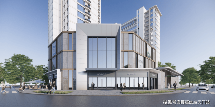 项目外立面设计上,立面利用大面积玻璃+阳台落地窗+金属型材+层间装饰提升建筑整体感和精致度,顶层外挑飘板使得建筑立面体块清晰,层次丰富。