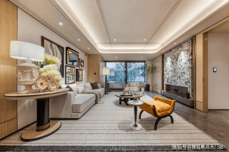 项目采用整块星空猫眼大理石打造的奢石背景墙,致敬荣宅的门头造型;并简化繁复的线条,勾勒出客厅纵横交错的浮雕勾线