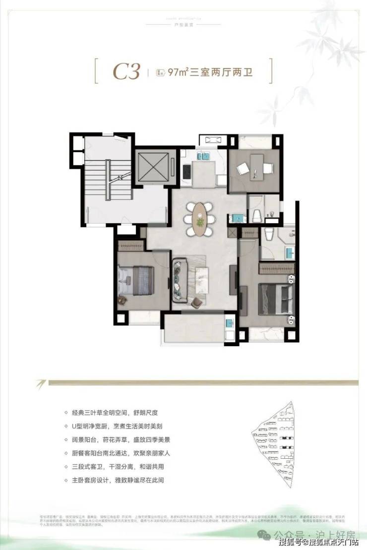经典三叶草户型,整个户型以客餐厅为中心点,自然延伸至各个功能间,室内没有多余的过道,几乎没有被浪费的过道面积。