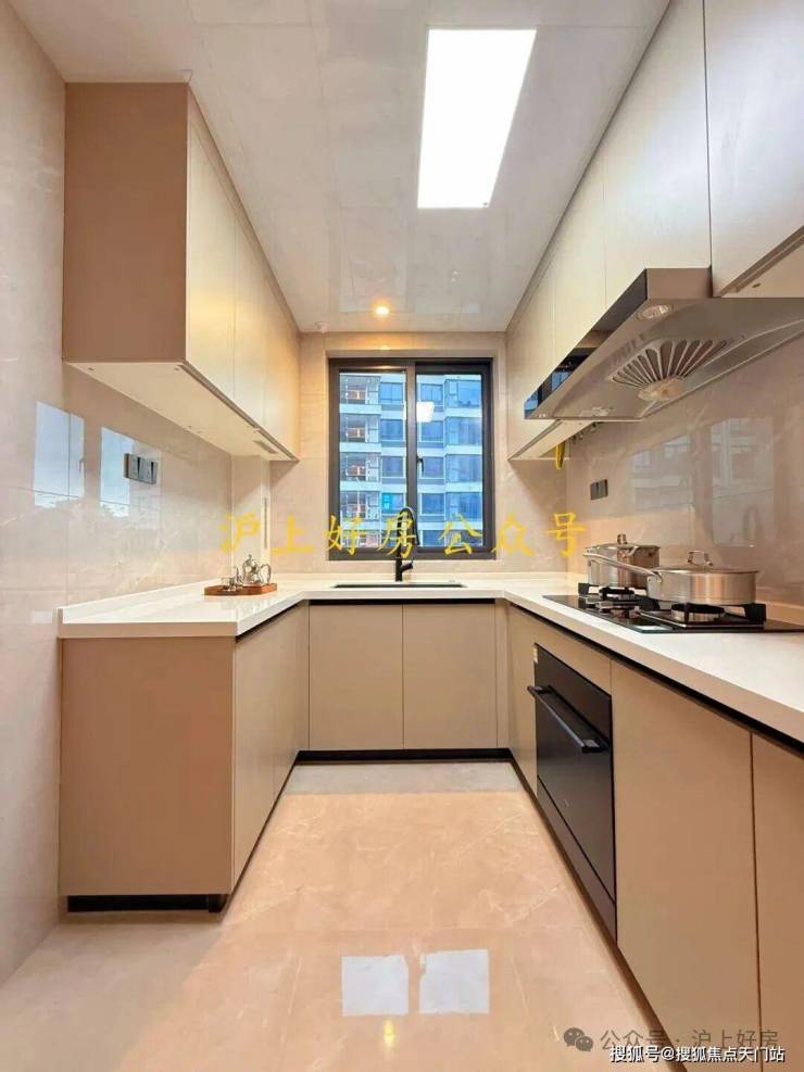 U型厨房,在这个面积段颇为难得,操作台面富裕;全玻璃移门设计,通透明亮。