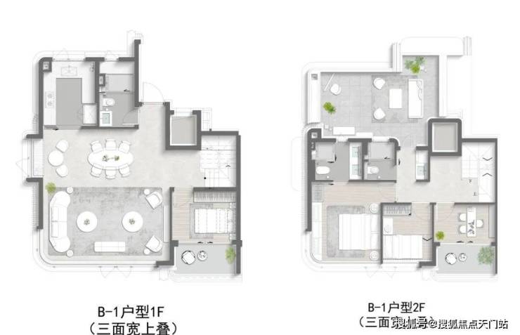再来说项目的 叠墅产品 :约 9.5 米南向三面宽、 独门独户 、 约 6.1 米地下室挑高(下叠)、 超大露台 (上叠),可以说,将墅居的尺度感和扩展空间拉满!
