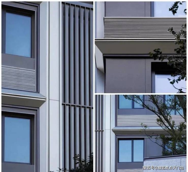 外立面设计以浅色香槟铝板线条、深色香槟铝板窗套搭配暖灰色真石漆,整体配色更具活力。
