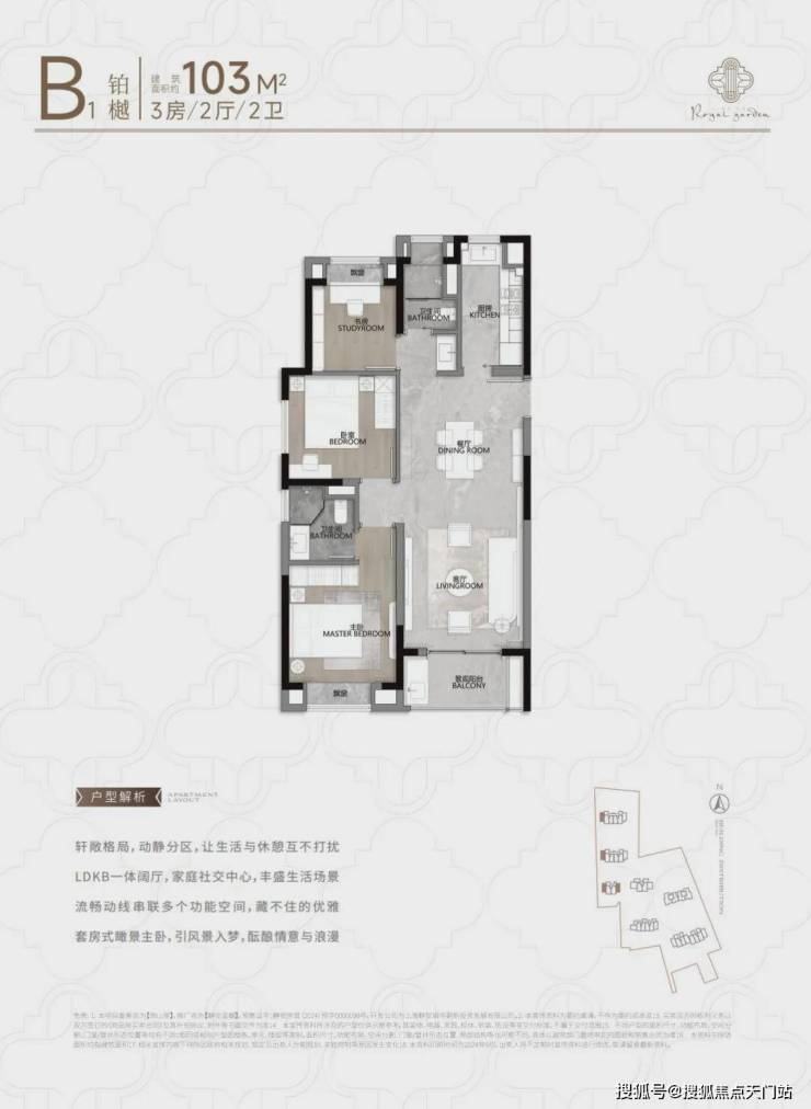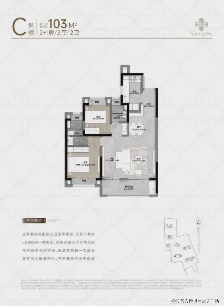 大面宽2+1房灵动户型!双开间大横厅设计宽景阳台,采光面充足!书房灵动空间可以根据家庭需求改变功能;大主卧套房尺度奢阔,隐私性非常不错!次卧出来就是次卫,三口之家居住的话相当于双套房设计,居住舒适度极佳!