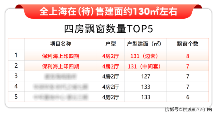 其中保利海上印四期待加推的建面约131㎡四开间朝南4房户型全部上榜,位列第五第六。