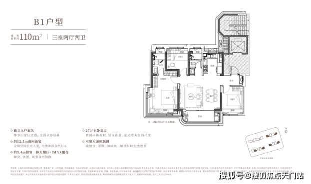 建面约110㎡宽厅3房,总价约700万级起