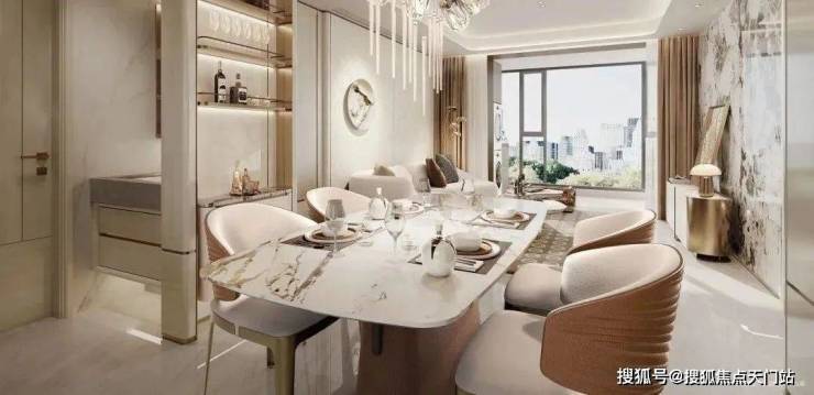 项目在产品打造上可以说是拿出了巨大的诚意。立面采用公建化鎏金幕墙,独创T型悬挑体系+流体曲面算法,打造中环封面;