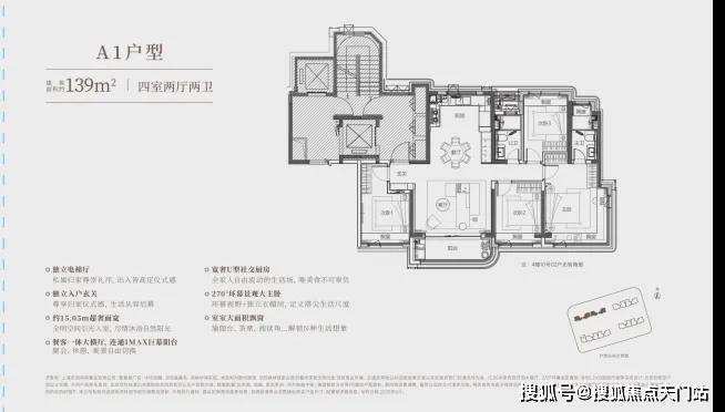 建面约139㎡4房户型,套数不多,但产品力绝对惊艳。四开间朝南,约15.05米宽的南向横厅、约1.6米进深的奢阔阳台,中环顶级享受的既视感。主卧约4.45米的进深,约4米大面宽(含飘窗),配合270°转角飘窗,是目前市面上产品力高配的户型之一,值得一冲!