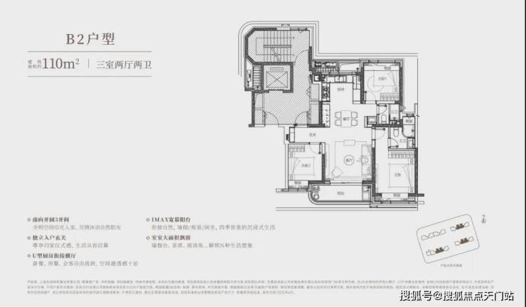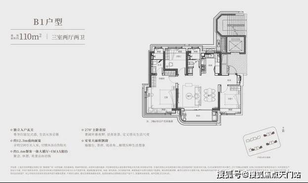 建面约110㎡边套(B1户型),1个宽面阳台、5个飘窗,整体南向面宽做到了约12.3米,大横厅面宽约5.4米,带来超大空间体验和充足通风采光。更为难得的是,该户型标配了全屋飘窗,主卧更是拥有270°转角飘窗,拓宽室内景观视野的同时,增加了实际空间使用率,加上三玻两腔系统窗隔音,在欣赏窗外景色的同时,也不会被噪音打扰。建面约110㎡中间套(B2户型),也同样做到了南北通透,三开间朝南,洄游动线,布局合理,无论是空间尺度还是通风采光,与边套享受一样的品质感!