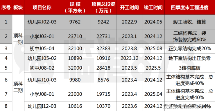 顶科社区公建配套学校建设计划:上实•听海毗邻的J10-3地块幼儿园计划24年12月竣工,J08-01小学和J08-02初中分别计划在25年4月和5月先后竣工。