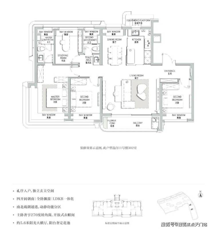 3、南向四开间,面宽约15.5m,独立餐客厅,南北通透