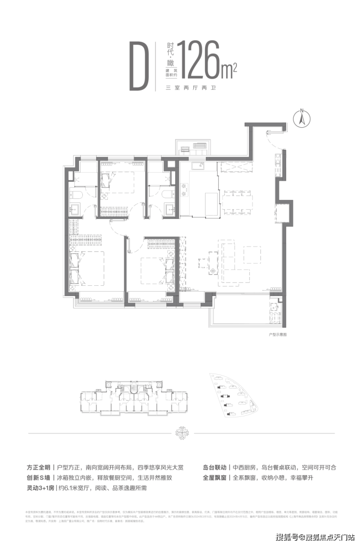 建面约126m²三房两厅两卫户型,南向3+1面宽横厅设计,让空间更加随心而变。主卧双台盆配置,用空间拥抱自然中的无限自在。