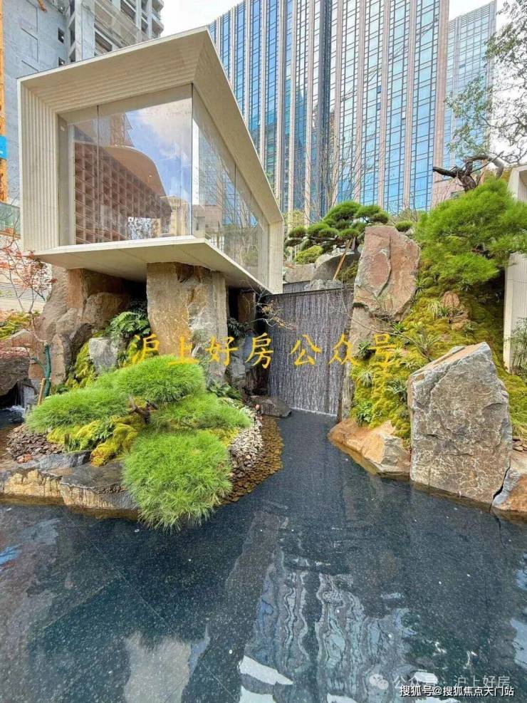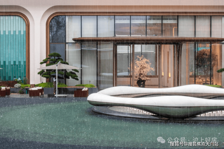 浮光池院水院会客厅,现已实景呈现,水景中央的艺术小品,如一滴水在湖面晕开,泛起阵阵涟漪。