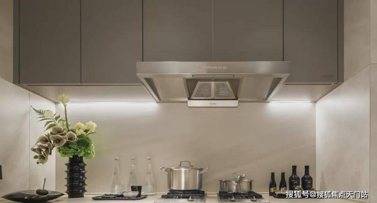 油烟机下方铺设的整块岩板,采用的是意大利 璞丹娜Casalgrande Padana(或同等档次品牌) 岩板,主打一个恢弘大气。