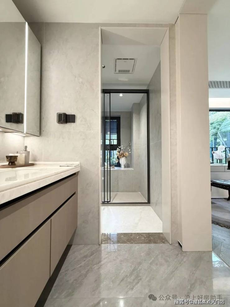 归家门厅设计为 弧形顶棚,非对称构图,圆润的形式提供给业主放松的情绪价值。可以说是处处体现人居的松弛感和舒适度。