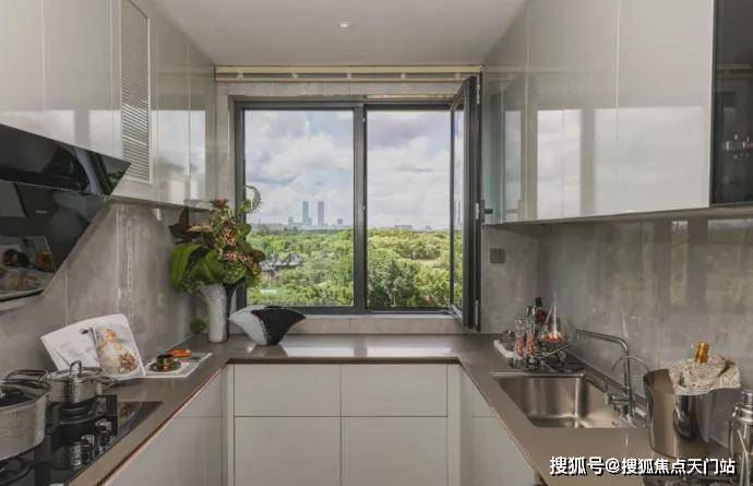 厨房配置西门子的灶台、油烟机、洗碗机高配三件套,弗兰卡的水槽及抽拉式龙头,石英石台面,欧派定制柜柜体等。