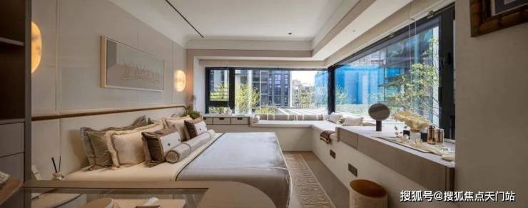 主卧拥有270度环幕飘窗,视野和采光优越,配备了高奢卫生间,空间感、尊崇感拉到顶格。