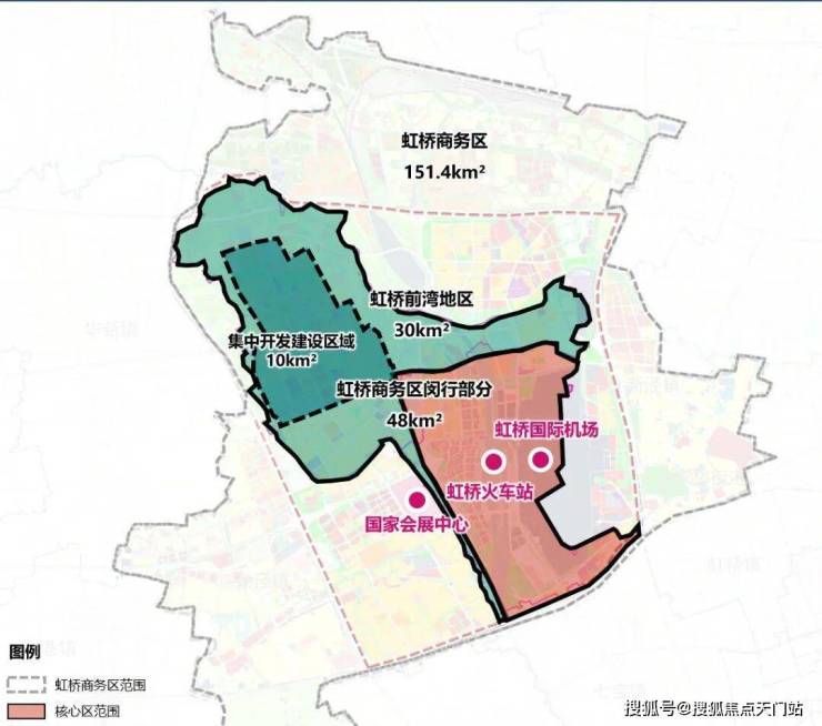 隶属于嘉定区的部分称为北虹桥,隶属于闵行区的部分则有48平方公里,占虹桥商务区总面积近1/3,而虹桥商务区闵行区部分又分为两部分——18平方公里的虹桥枢纽核心片区以及30平方公里的前湾片区。