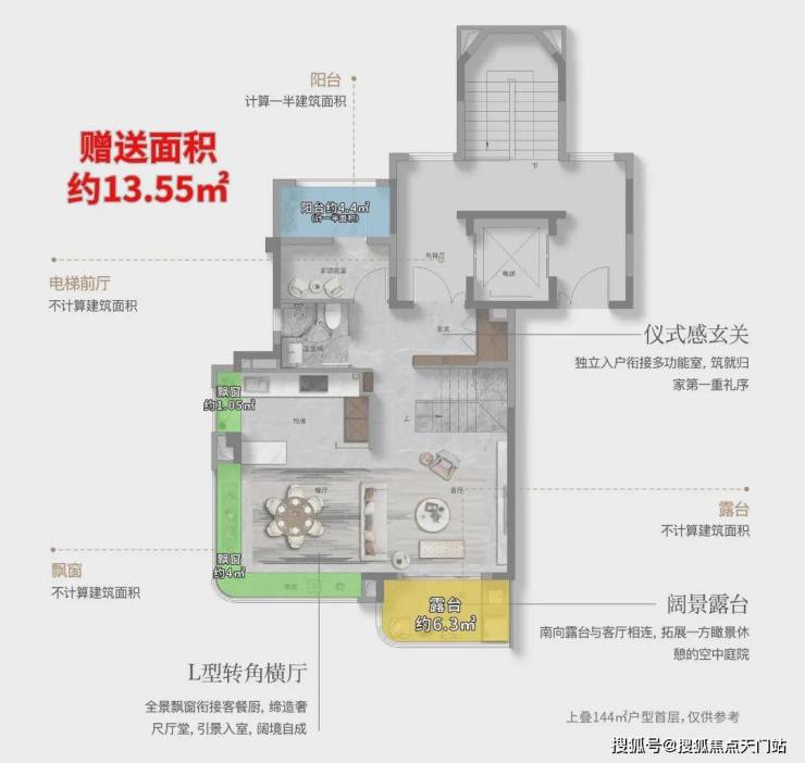 建面约144㎡的上叠产品,通过巧妙的挑空、总计约15㎡露台及灵动空间设计,让户型的实际可使用面积高达约180㎡,实得率约125%。
