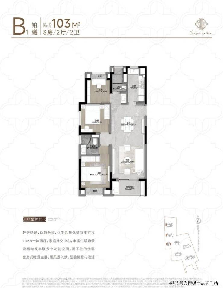 适合三口之家或年轻家庭居住的动静分区户型,厨房、餐厅、客厅及阳台一体化设计,动静完全分区设计,相当人性化!主卧套房设计满满尊崇感;次卫三分离干湿分区设计,考量十分贴心!