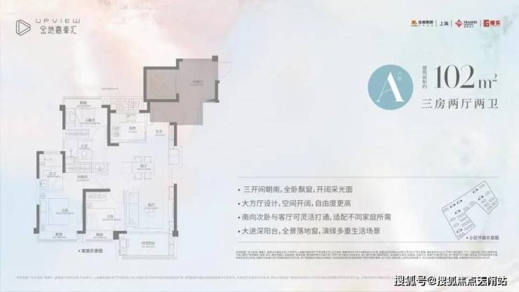 A户型是建面约102㎡3房2厅2卫,该户型三开间朝南,采光效果上佳。大方厅设计,空间开阔自由度更高。南向次卧和客厅可灵活打通,适配不同家庭所需;大进深阳台+全景落地窗,让室内的通透性和视野可圈可点。