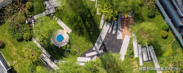 中岛水景,池底采用蓝钻花岗岩和阿尔卑斯灰仿石砖拼花定制星语言铺地,包括两边景墙立面选用高端的爱马仕灰奢石,彰显出顶级石材的大气典雅。包括景墙转角的弧面,工艺难度非常大。