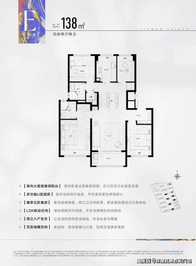 此户型为飞机户型,可以说是改善人群非常喜欢的户型,建面约138㎡4房2厅2卫设计,动静分区,三开间朝南,各空间尺度奢阔,还有一个大面宽景观阳台,实现功能性和舒适度兼得。
