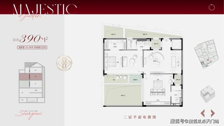 叠拼面积段约195-310㎡,分为1-2F下叠、3、4、5F为中间的平层面积236㎡,6-7F为上叠,计56套。
