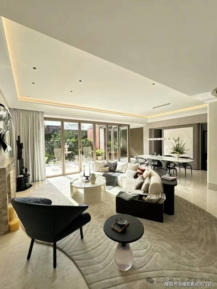 「无界空间」:客厅270度转角无柱设计,搭配落地玻璃,开阔视野将院中风景迎入日常。
