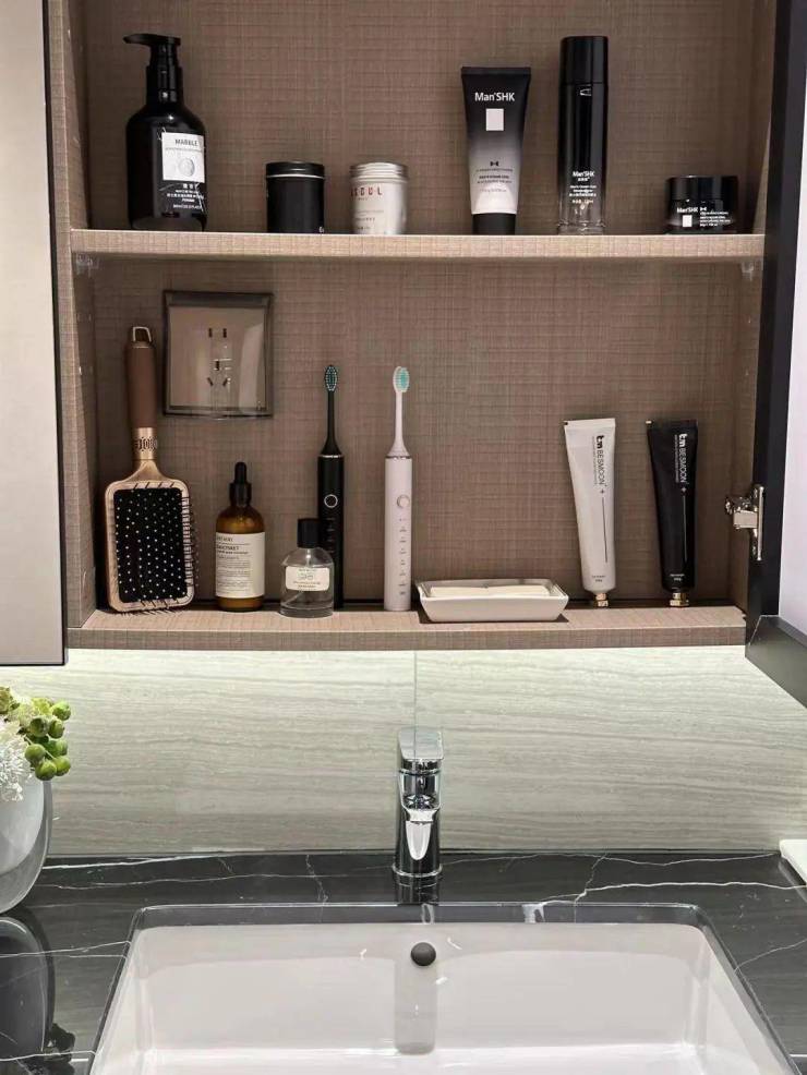 卫生间镜柜内部插座面板,让电动牙刷、冲牙器、电动剃须刀众多设备内置,保证美观度等等。