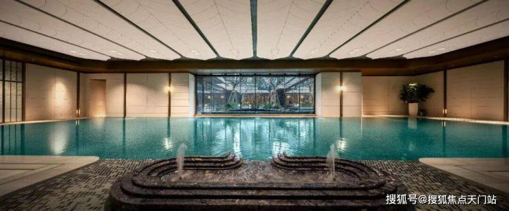 恒温泳池 :第一,采用了景德镇烧制的陶瓷马赛克,独特的釉面色彩由景德镇老师傅手工浇筑而成,充满人文艺术底蕴;第二,羽毛天花造型,由600余件铝板打造,表面采用了仿贝壳纹的艺术漆处理,带来松弛度假感;第三,不仅配置了约25m×10m的4道泳池,还采用了奥运会同款空调除湿系统,彰显高档品质细节!