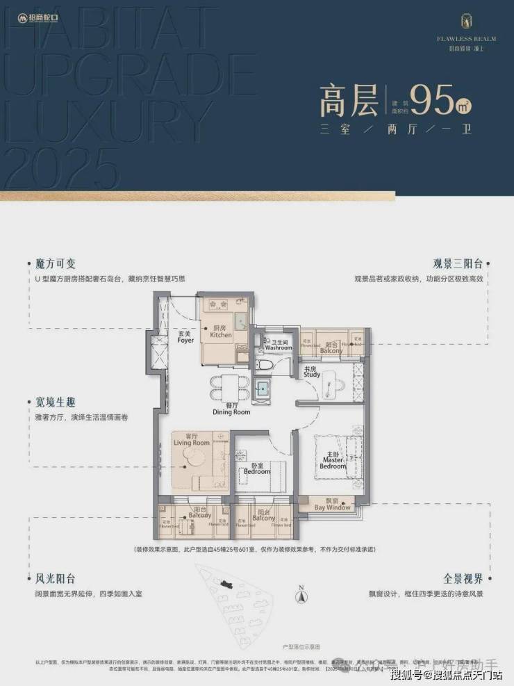 高层户型为建面约95㎡,设计方正且全明,3阳台设计,为业主提供更加舒适的居住环境。