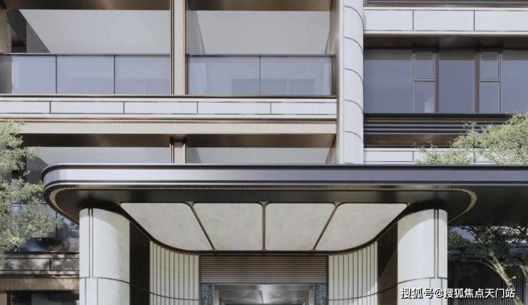 在楼栋主入口同样运用 石材+弧形铝板等元素,同时还有格栅装饰,质感提升明显: