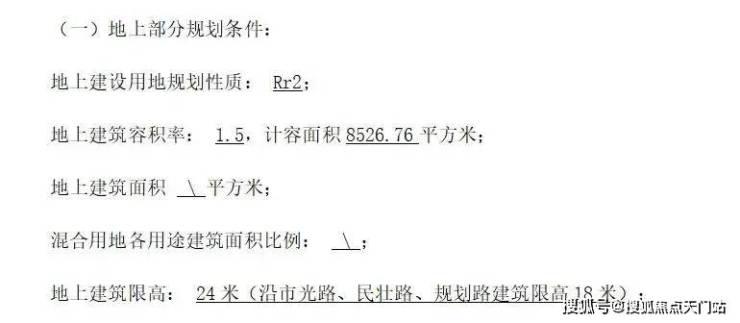 根据出让内容,该地块建筑面积只有约8526.76㎡,容积率为1.5,地上建筑限高为24米,其中沿市光路、民壮路、规划路建筑限高18米。