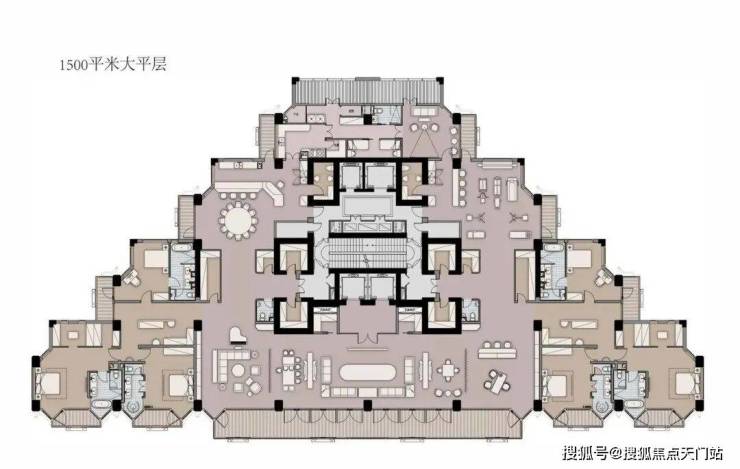 最豪气的还是这个整层一户建面约1500㎡的大平层户型。它南向面宽达60米,有14个阳台!