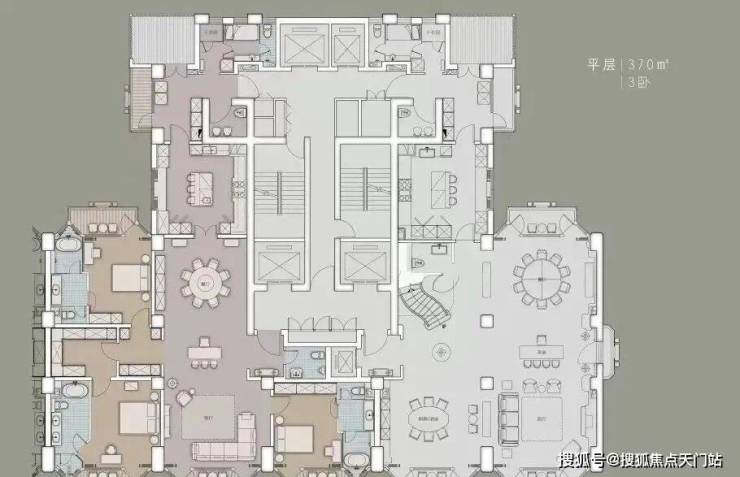 项目分三期开发,2号楼户型分布为一层4户,中间两套为375平米边套为680平米复式,总楼层39层,有两层为避难层,避难层会改造成绿化休闲区。