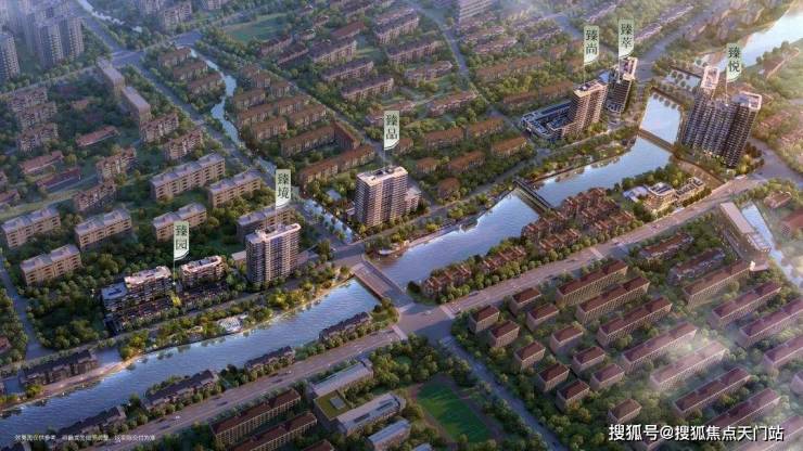 同时,整体建筑布局随河蜿蜒,高低错落的建筑形态也契合了江南水乡的水韵特色,加之建筑顶部的金冠起伏,与景观河交相辉映,串联成金色丝带东西贯通,更是凸显了本项目的高标准、高品质的居住体验。