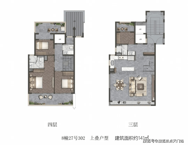 3 层为会客生活区,约 270° 转角飘窗收纳满屏美景,客餐厅一体化设计减少空间迂回,保障家庭交流;北向卧室连观景阳台,作为老人房再合适不过,多成员家庭日常需求全满足。