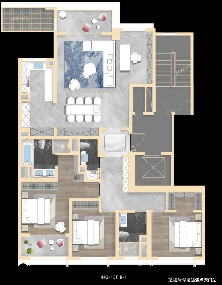 尤其 主卧星级套房 ,配置独立衣帽间、书房,奢华主卫四分离,双台盆+淋浴区+大浴缸+智能马桶,私密性&奢适度无敌;