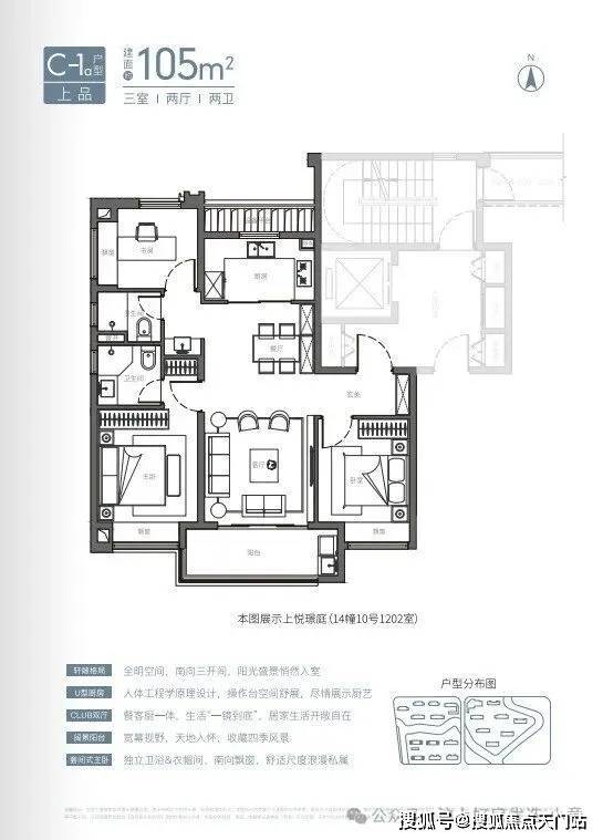 建面约105㎡3房2卫:项目建面约105㎡3房2卫有两种风格(宽厅、竖厅),尤其是宽厅户型,设计格外惊艳。