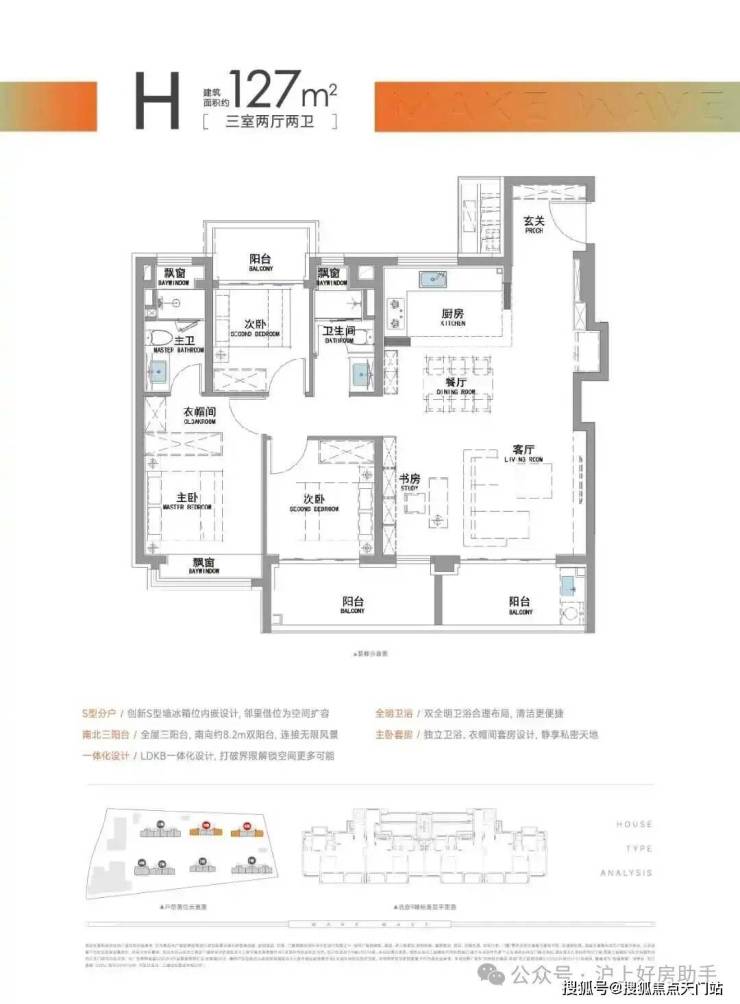 建面约127㎡三房两厅两卫,该户型最大的亮点是有着比肩豪宅的南北三阳台黄金布局,这是2025年之后,松江首个三阳台户型。
