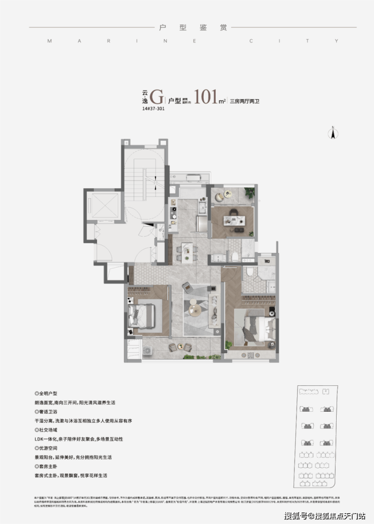 建面约101㎡高层三房F和G户型,在尺度感上更进一步,三个卧室处于房子的三个方位,孩子、长辈都有自己的私密空间。