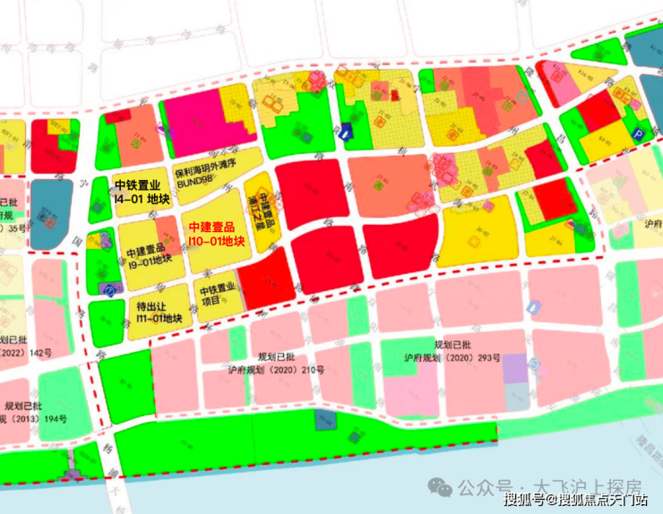 在杨浦滨江版九宫格中,主要是高端住宅+1块风貌商办,而紧邻九宫格的四至方位可以看到: