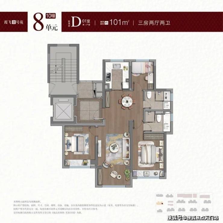建面约100-101㎡户型, 拥类独立电梯厅,无连廊+飞机户型南北通透。