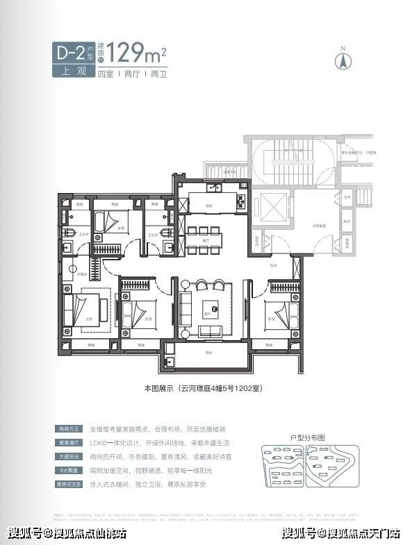 云河璟庭4#南向对望半岛公园,东边套可赏中庭景观;建面约129㎡四开间南向户型和建面约105㎡大面宽客厅户型,可同时观河景、揽园。