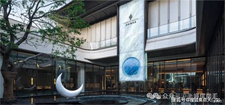 深藏于建筑怀抱之中的 下沉式「琉璃光院」 ,是历经数十版方案淬炼出的灵魂之作。御湖境标志性 汉白玉玄月族徽 ,与 高10米的蓝水晶奢石光幕 ,共同演绎 “日月同辉” 的震撼场景。庭院深处 50年乌桕树王 矗立。