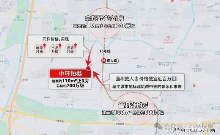 同样是地铁房,往前一站的桃浦百平三房,已经是800万级,「中环铂樾」首开66000元/平的惊喜均价,总价约700万+,同样是三房产品,劲省100-200万!