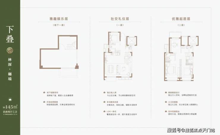 以145㎡下叠为例,四房两厅三卫全能格局,非常适合二娃家庭以及三代同堂。