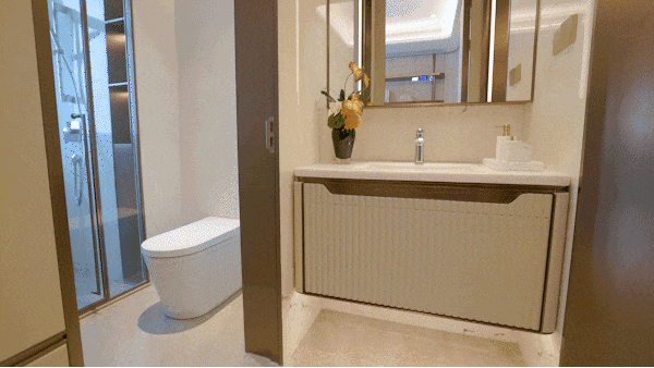 踢脚线全包的处理,看似简单,实则蕴含着对细节的追求。镜柜与门楣到顶的设计,拉伸了空间的视觉高度,让整个空间显得更加开阔、通透。