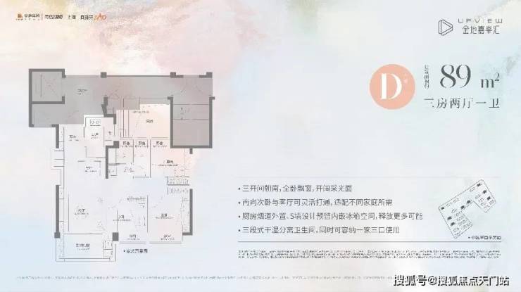 建面约89㎡三房两厅一卫(D户型), 不仅功能完备,而且很好地把控了总价,约350万起即可上车高配品质三房,堪比市场上110平左右的空间感!