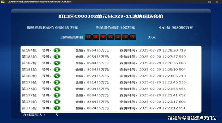 2025年2月,今年第一批次土拍中, 经过 184轮 竞价, 金茂&庆隆联合体 以总价896435万元竞得 虹口C080302单元hk329-11地块,溢价率38.2%,折合 楼板价117474元/㎡,装修标准不小于4000元/㎡。